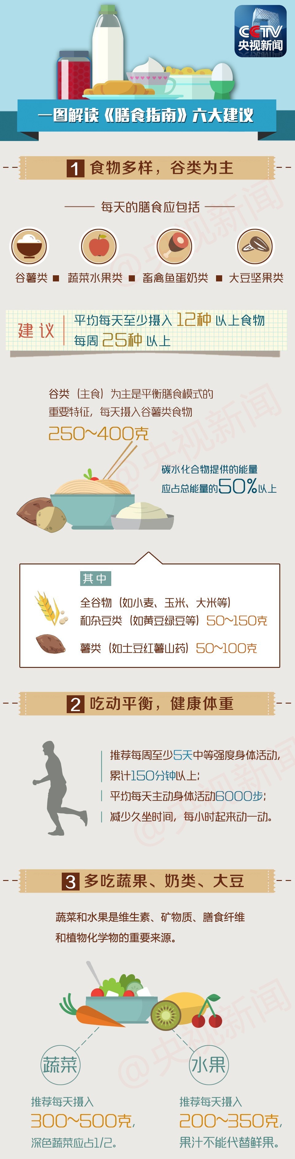 這本權(quán)威的“吃飯指南”歷時(shí)兩年半時(shí)間完成,既包括一般人群的膳食指南,也包括特定人群膳食指南(嬰幼兒、孕婦乳母、兒童青少年、老年人和素食人群)等,更加強(qiáng)調(diào)食物的多樣化與均衡,其中有六大核心推薦。